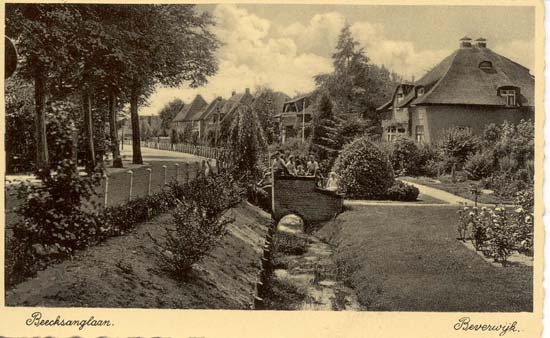 De Beeckzanglaan in de vijftiger jaren. Op het bruggetje wordt er druk geposeerd door de jeugd. De beek stroomde vanaf de duinen om uiteindelijk in de vijver van de kinderboerderij “Ankie’s hoeve” op het stationsplein uit te komen. Dichter en toneelschrijver Joost van den Vondel schreef het gedicht Beecksangh over Scheybeek. De beek vormde de grens tussen Beverwijk en Velsen. De Scheybeeck is verlengd en loopt en loopt nu dwars door de parken, helemaal richting Wijkeroog.