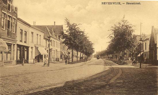 De Breestraat rond 1920, de (verhoogde) rails van de stoomtram zijn nog aanwezig. De woningen aan de linkerzijde zijn, op een enkele uitzondering na, allemaal winkels geworden.